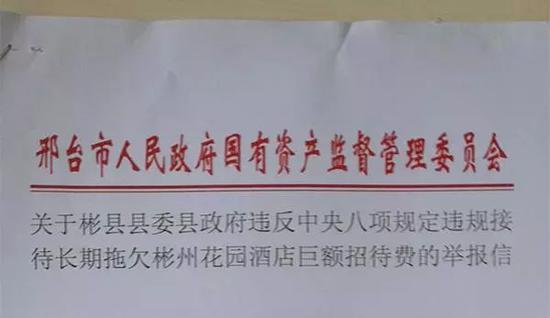河北省邢台市国资委的这封《举报信》提到,巨额欠款“是彬县(彬州市)县委、县政府严重违背中央八项规定,大吃大喝,顶风作案,违规招待,超标接待所积累形成的账款。”