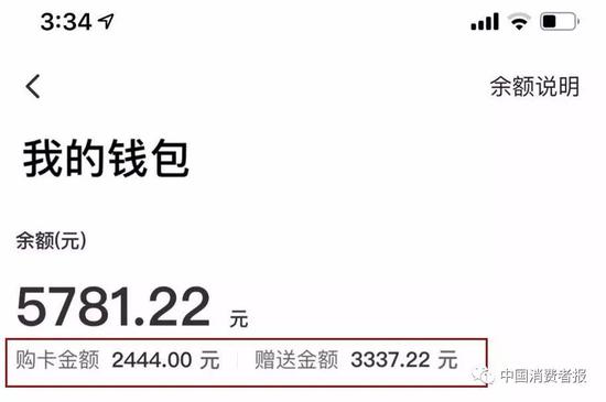 ▲池女士卡内余额,其中购卡金额2444元,赠送金额3337.22元。