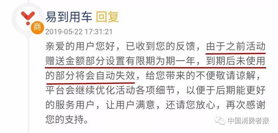 易到用车对此回复称,是因为“之前活动赠送金额部分设置有效期为一年,到期后未使用部分将会自动失效”。
