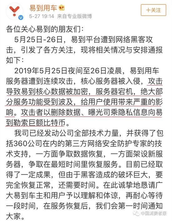 5月27日,易到用车在微博发文,指出5月25日夜间至26日凌晨,平台服务器遭到连续攻击,核心服务器被入侵,大部分服务功能受到波及,平台已经报警并进行修复工作,请用户予以理解和体谅。