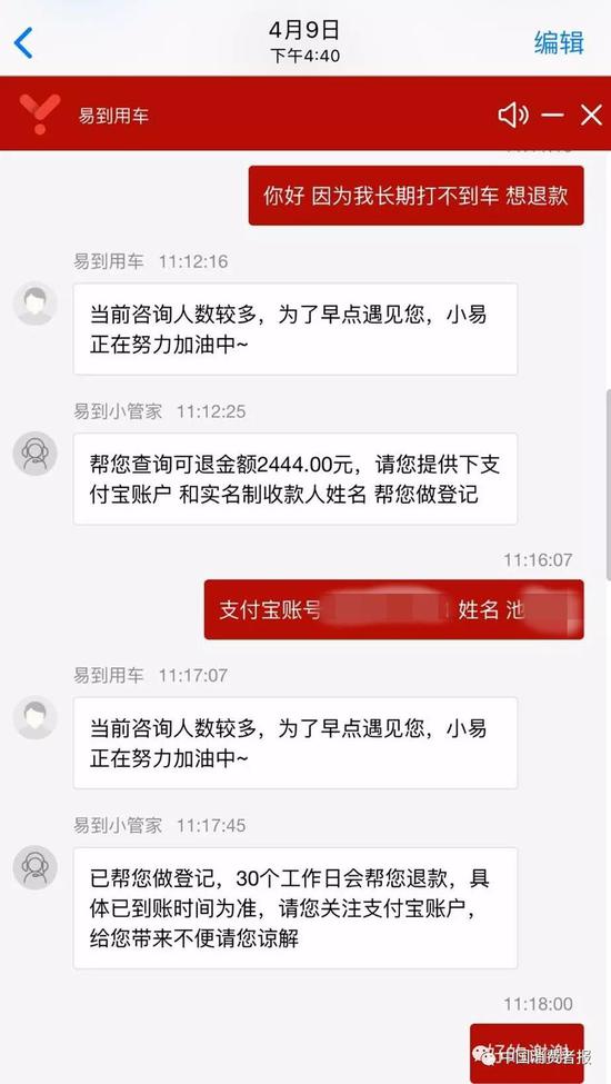 今年4月9日,池女士又重新申请,经易到用车客服核实后,可退还金额为2444元,并承诺在30个工作日内退还。但是直到6月,池女士也没有收到退款以及来自易到方面的任何解释。