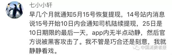 易到用车的司机唐建忠告诉笔者,去年8月,他在平台就无法提现工资了,至今仍有1.5万元被扣。其他地区的司机也遇到了同样的情况。很多司机不敢继续在易到用车接单,所以才出现了消费者在该平台打不到车的情况。“消费者的每一笔打车费易到用车要分走35%,司机本身赚的也不多,平台不仅一直拖欠工资,还要求司机体谅理解。”唐建忠说。5月15日,易到用车下发通知,司机可以在10日内分批提现。10天过去,唐建忠依然没有领到工资。