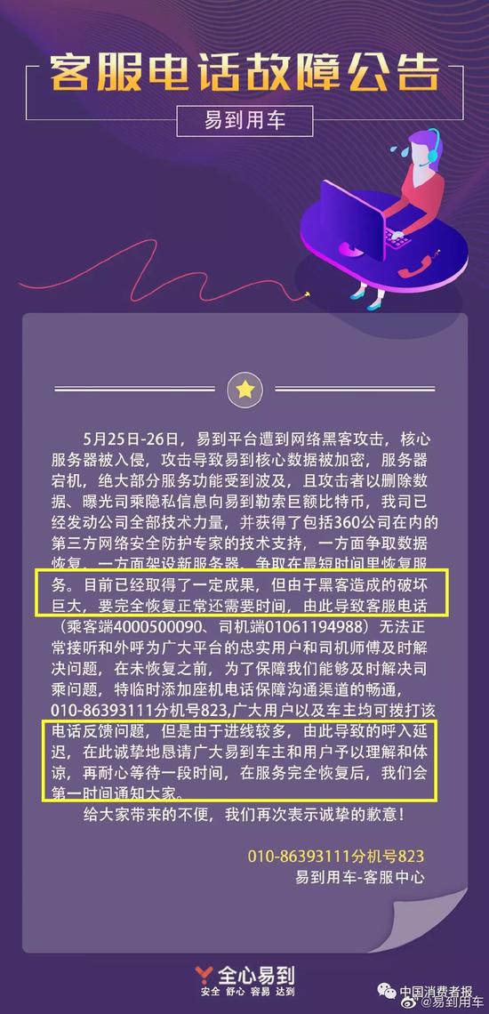 昨日(6月17日)下午,易到用车官方微博再次发文称“由于黑客造成的破坏巨大,要完全恢复正常还需要时间”,并公布了新的临时客服电话010-86393111分机号823。
