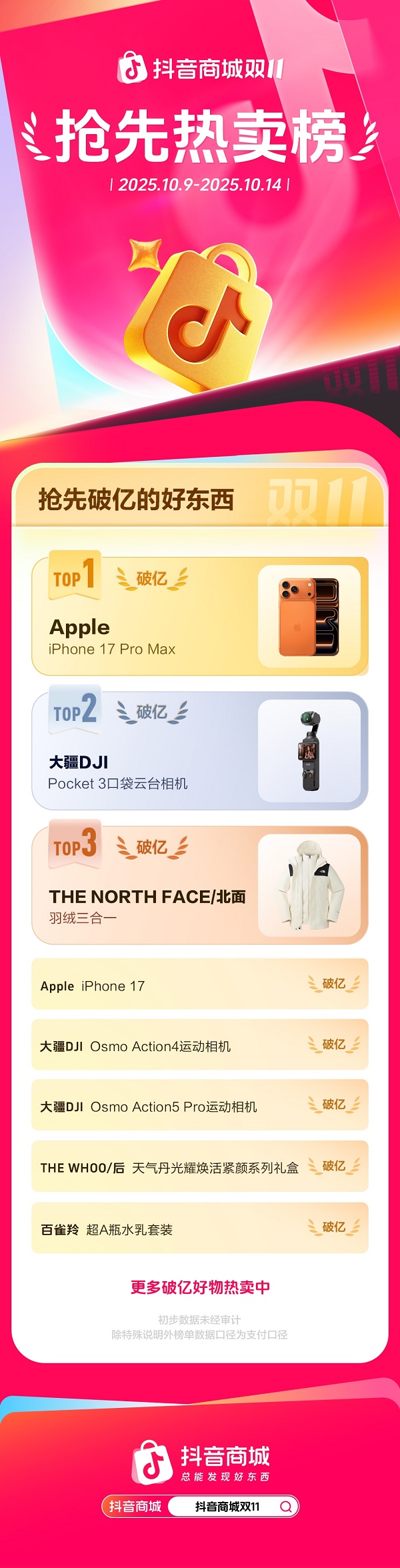 各行业海量好物在抖音电商热卖:手机、数码、护肤、运动户外等行业破亿爆款涌现。哪些产品深受用户青睐?10月15日,抖音电商发布双11“抢先热卖榜”,提前揭示双11爆款趋势!